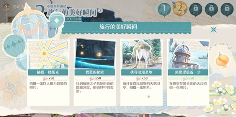 要前往碧蓝秘密地点,需要传送到疯愿之子营地的传送点。到达后向右前进,爬上木屋后穿过河流,会看到一个山坡。顺着山坡往前走,尽头有一个竖直向下的洞口,洞底就是碧蓝秘密拍摄地。拍摄以太阳为背景的照片时,只需选择晴天在开阔位置调整视角,让太阳成为构图的一部分即可。