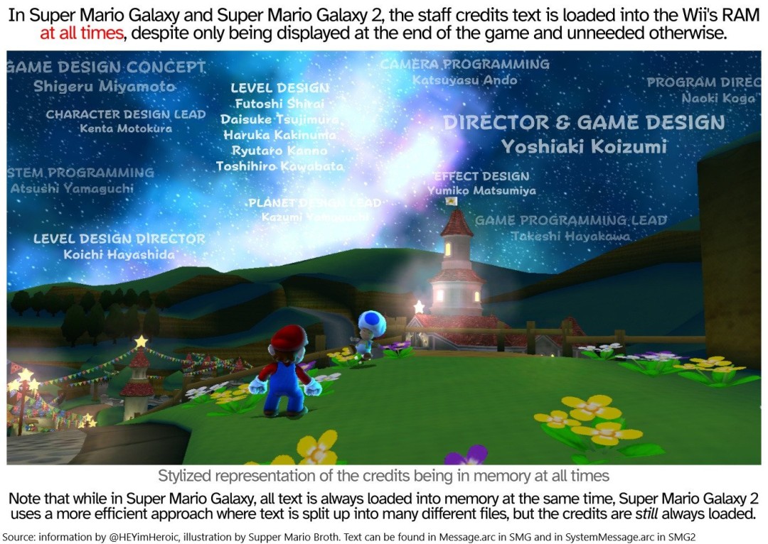 据马里奥考据博主Supper Mario Broth在社交平台透露,《超级马里奥银河》系列游戏始终将制作人员名单预载在运行内存中。尽管游戏的制作人员名单只有在通关后才会显示,但《超级马里奥银河》依旧把这些名单内容常驻在后台。虽然这种处理极其低效,但意外地令人动容——游戏似乎通过让创作者之名常驻内存的方式向他们致敬。