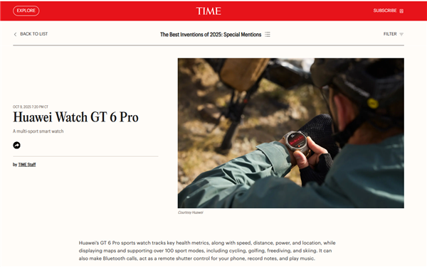 《时代周刊》评价称:华为Pura 80 Ultra将“专业相机理念融入手机”,重新定义了移动摄影边界。华为Watch GT 6 Pro凭借卓越的运动监测、健康管理与续航创新入选。