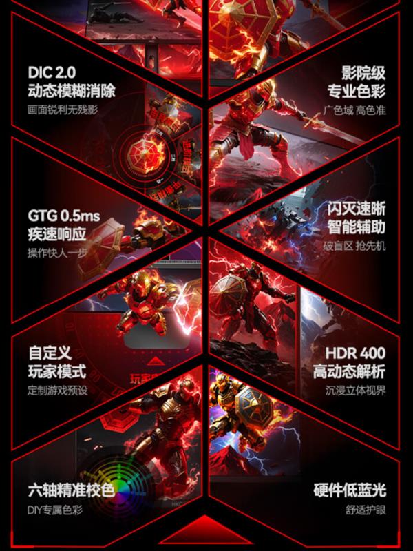 除了面板的核心升级,HKC UG25EF还围绕“职业电竞体验”打造了一系列专属功能,如DIC 2.0动态模糊消除技术,通过智能算法对画面进行实时优化,有效减少了在快速移动或转身时产生的画面模糊现象。无论是赛车游戏中的风驰电掣,还是FPS游戏中的快速扫射,都能保持画面的清晰与锐利,为职业选手提供“操作快人一步”的竞技优势。另外还有闪灭速晰、六轴精准校色、定制游戏预设等智能辅助功能,帮助玩家更好打造专属自己喜好的游戏画面,满足不同类型的游戏需求。