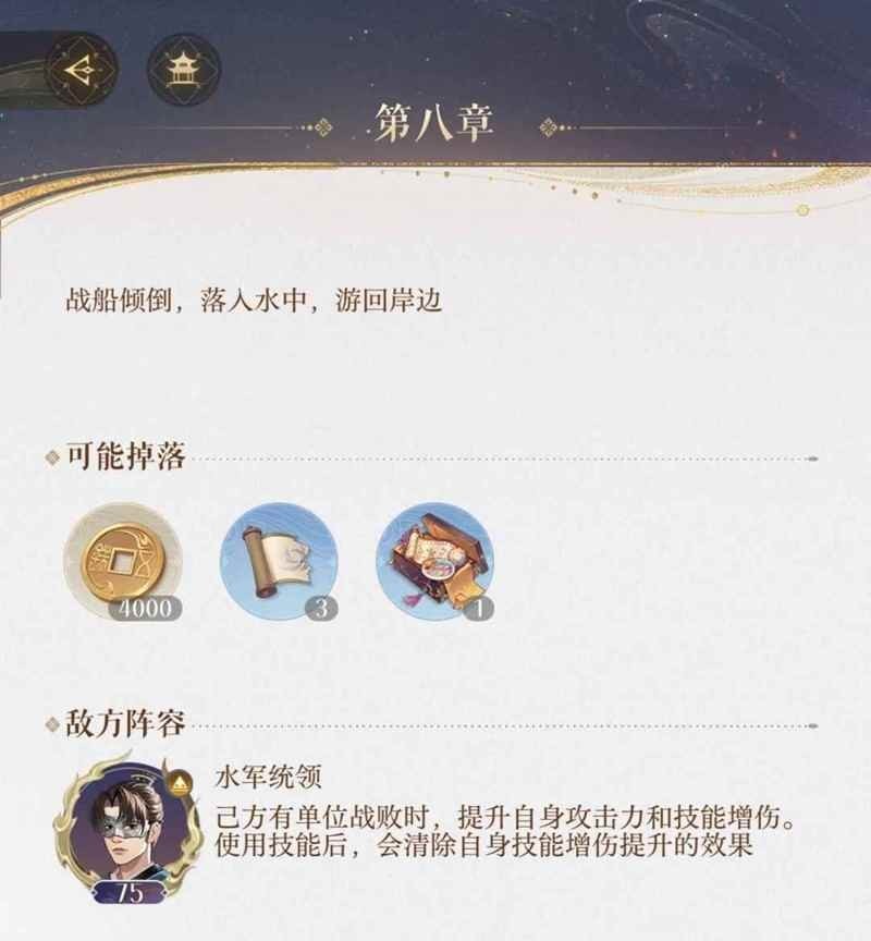 结语:上面就是心愿游戏小编为您收集的如鸢代号鸢主线第八章 8-7水军统领低练度攻略,希望有帮到大家,更多相关的文章请关注心愿游戏