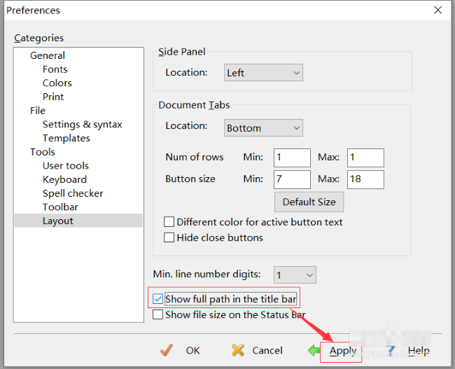 4、然后找到右侧中的Show full path in the title bar"",将其小方框勾选上,并点击"Apply"按钮就可以了。