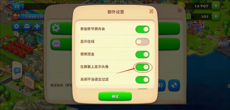 在额外设置界面中,可以看到一个显示头像的开关选项。将这个开关打开,当按钮变成绿色时,就表示头像显示功能已经成功启用。此时退出设置界面,返回游戏主页面。