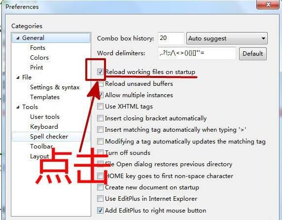 2、进入到新的窗口界面后,找到右侧中的"Reload working files on startup",将其小方框取消勾选。