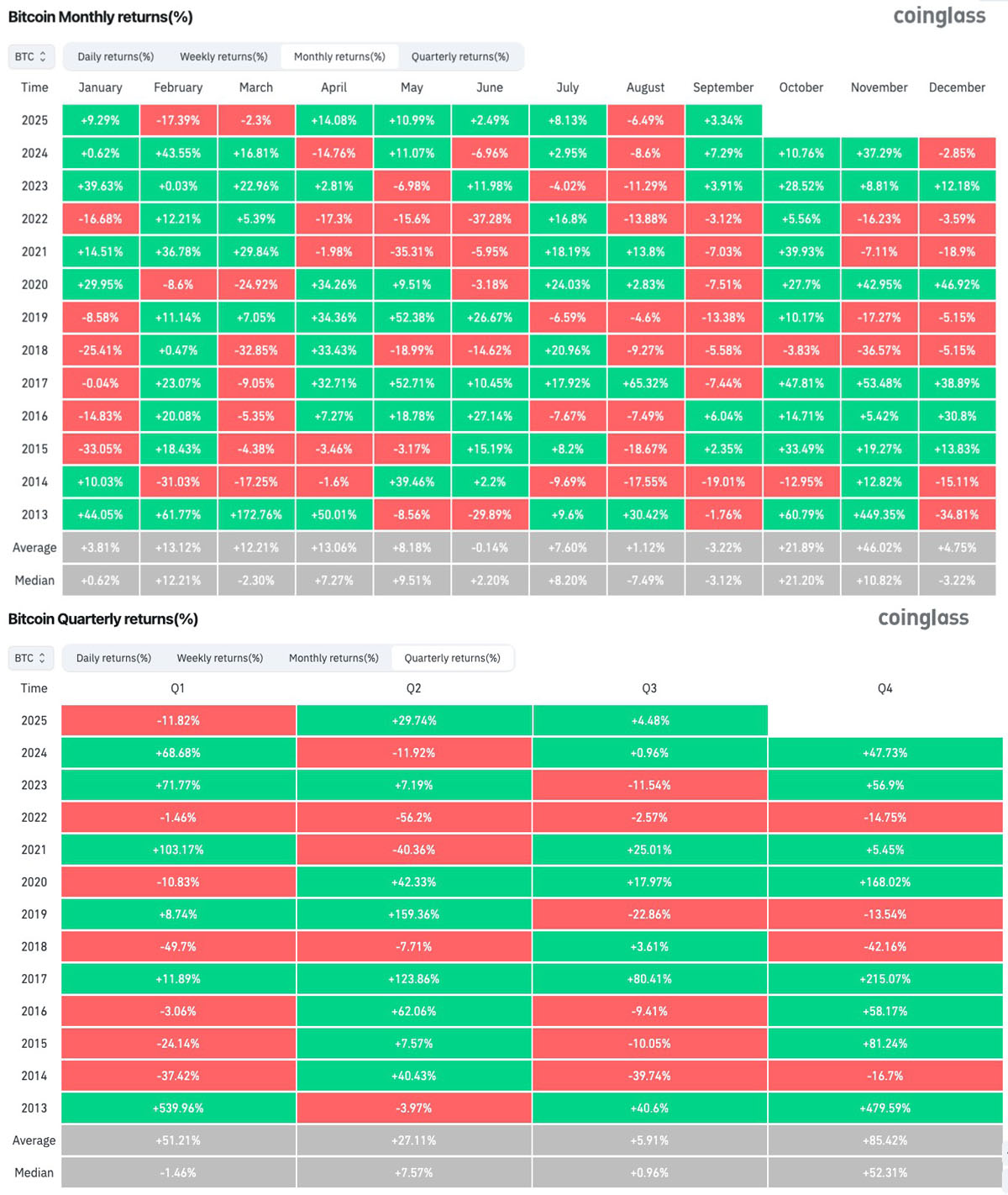 BTC兑美元月度、季度收益(截图)。来源:CoinGlass