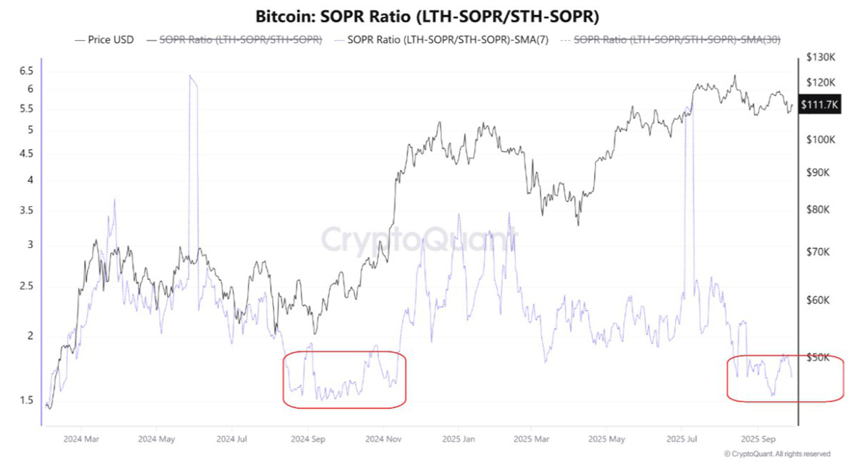 该帖使用了已花费输出利润率(SOPR)衍生指标,衡量链上币移动时是否盈利或亏损。长期与短期SOPR比率显示新投资者在回调中亏损出售。