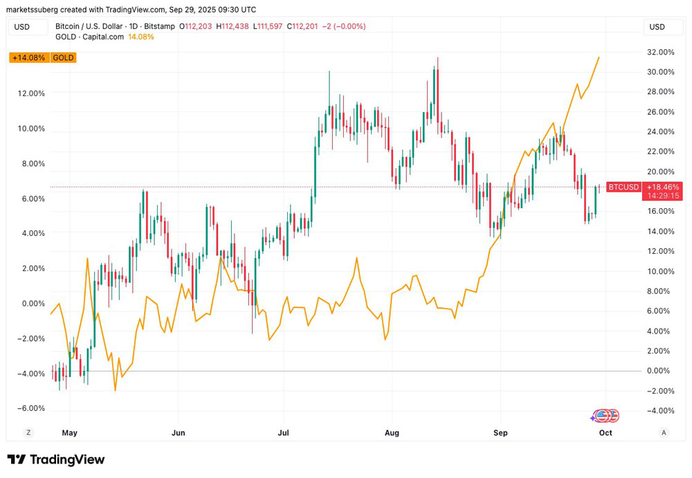 这一走势延续了本季度比特币交易者普遍关注的模式——黄金表现优于比特币。