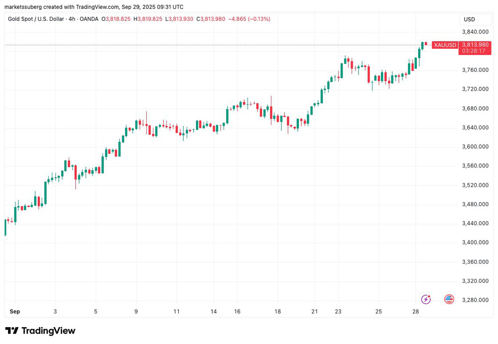 XAU/USD周一创下历史新高,首次突破每盎司3,800美元,因美元走弱。