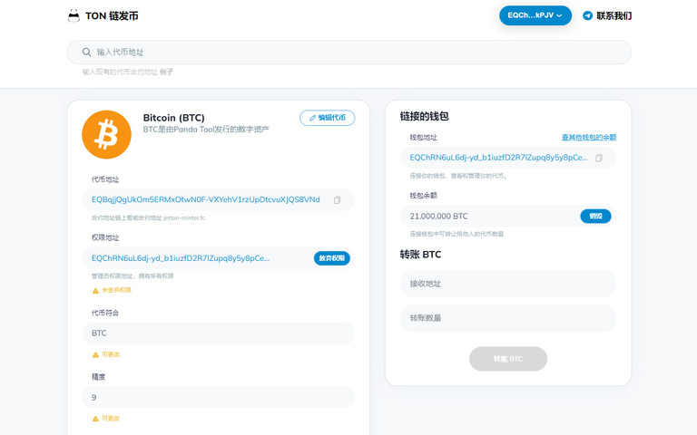 答:你可以使用其他钱包发行代币,但是管理代币权限、修改代币参数,只能使用Tonkeeper钱包。