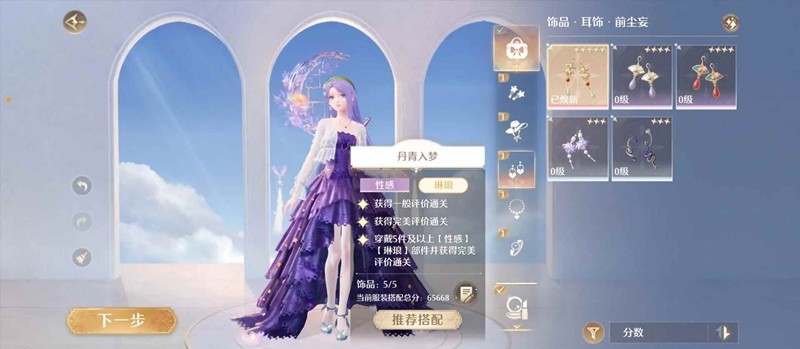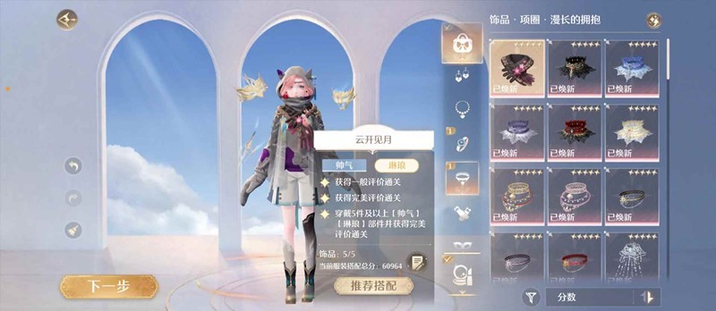 第七场性感琳琅,满星5件性感琳琅。有猫套用猫套,没有的话5星耳环前尘妄(分不够就焕新这个)+4件0级三四星性感琳琅饰品+星之海/心湖涟漪混搭(有海浪/蝴蝶自行贵替)即可满星,分数线9.1w左右