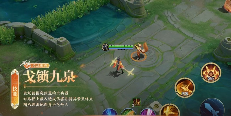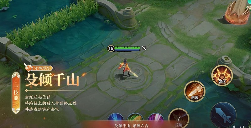 守御形态:使用殳/矛,近战防御,一技能击退路径目标,二技能回血。