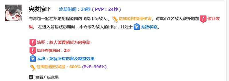 凯茜的大招名为突发惊吓,冷却时间为24秒,释放时她会钻进背包冲向中央敌人并引爆,造成600%的范围物理伤害。命中目标后附加惊吓效果,使敌人反向移动持续两秒,具备一定的控制能力。值得注意的是,凯茜在背包中处于无敌状态,期间免疫所有伤害与控制,这不仅提升了她的生存能力,也让技能释放更加安全稳定。