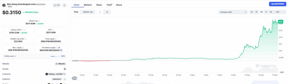 MOODENG目前价格约为0.31美元,在过去24小时内实现了惊人的110%增长,在过去一个月内(截至2025年5月14日)增长了1045%。这一涨势使MOODENG在市值排名中上升至第304位,在交易所上市后交易量飙升至7.9351亿美元。在2025年5月11日于币安Alpha网络上市后,代币价格飙升500%,在DeFi更新后又额外增长了80%,表明了投资者的兴趣。