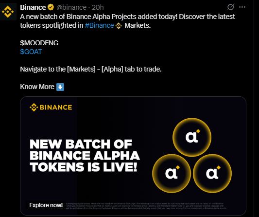关键催化剂?币安上线 Alpha 项目,有望成为早期高增长代币的启动平台。这不仅能提升 MOODENG的流动性,还能提升其在 memecoin 领域的地位。