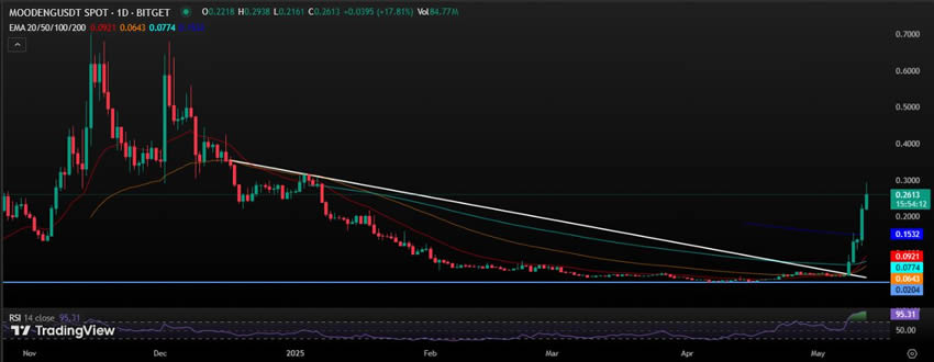 日线图上,MOODENG/USDT 呈现看涨势头,突破长期下行趋势线,确认趋势反转。黄金交叉形态,20 日和 50 日均线与 100 日和 200 日均线相交——典型的看涨信号。RSI 位于 95.59,表明极度超买,且买盘压力巨大。