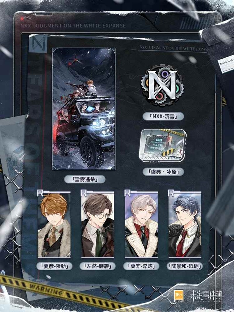 二、「NXX-冰原上的审判」活动女神之影限时开放,活动限定思绪夏彦SSR【烽途】、左然SSR【彼界无光】、莫弈SSR【晶谜幻影】、陆景和SSR【擎火】获得概率提升