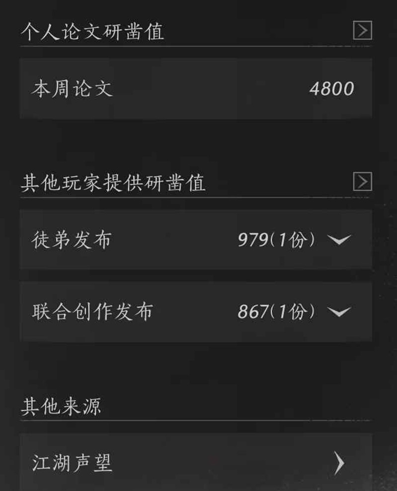 地位继续晋升需要研凿值,研凿值分为三部分获取,自己论文的研凿值、江湖声望、和联名的研凿值。所以需要寻找联名作者,互相挂名。