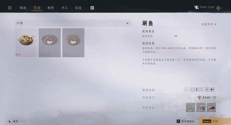 注:涮鱼为100级新增益食物,食用后可获得120-240点外功攻击!!打本必备食物!