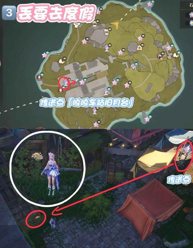 传送至「呜呜车站旧月台」,往小地图东方向行走,从黄色和红色的帐篷中穿过,走到尽头,史丢丢在墙旁的木箱上