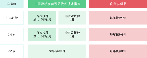 根据实际情况。我国《中国流感疫苗预防接种技术指南》和疫苗说明书的免疫程序有所区别(下图),一般来说在 6 月龄~8 岁儿童中接种 1 针或 2 针,在≥9 岁人群中每年接种 1 针,实际执行中以接种单位执行要求为准即可。