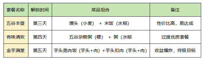 套餐机制:解锁两个上菜位后,将套餐所需菜品放齐后再点开始营业。套餐内菜品数量无硬性要求(如10米饭+1馒头也可激活50%加成)。