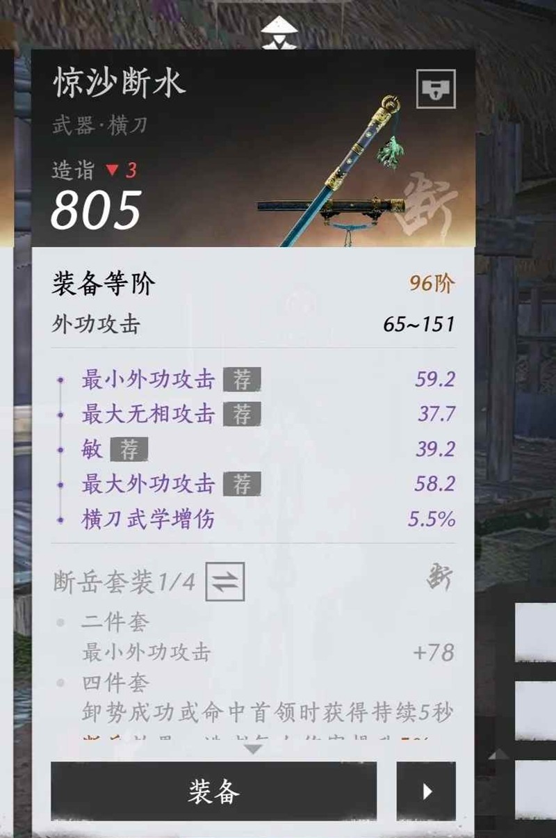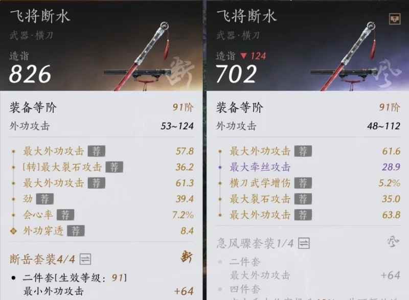 左边四件:唐刀/陌刀增伤,双大外+劲/敏+会心+全武增最佳定音外功穿透,不要无相只能过渡