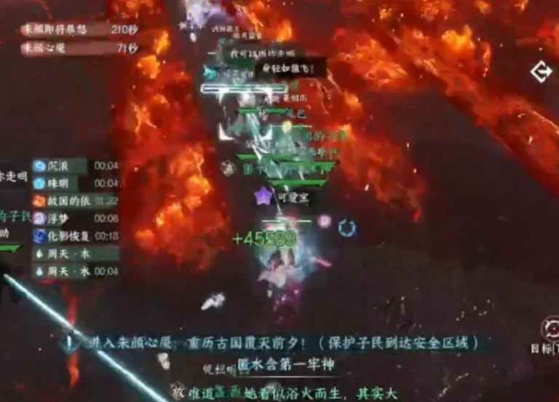 跳过去或者走得太快容易让子民碰到火圈掉血,奶妈这里注意抬好子民血量,只要稳稳走过去保证五个子民存活即可进入三阶段。