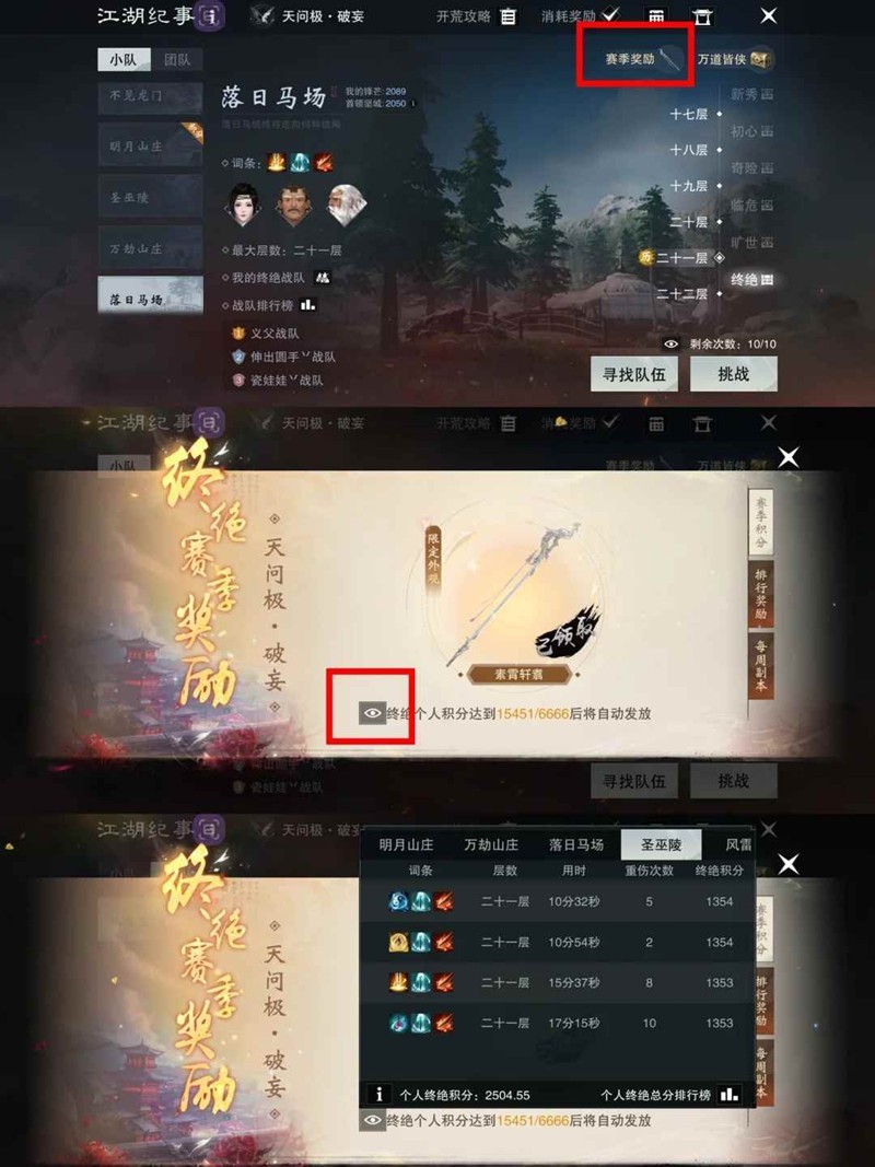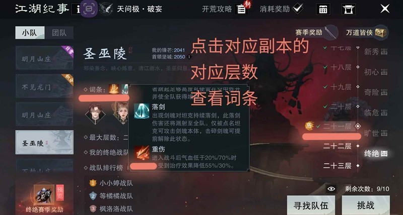 词条积分查看:点击对应副本的对应层数可以查看词条(图4),点开个人终绝积分可查看每个副本的积分。这个积分是根据副本表现来的,比如层数高低,死亡次数,输出/治疗高低等,也能看出某个词条有没有刷过,哪个副本哪个层数还没刷过