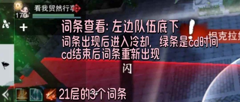 词条查看:左方队伍的右边有个按钮可查看词条,词条出现后进入冷却,词条周围的绿条就是在cd,cd结束后词条重新出现