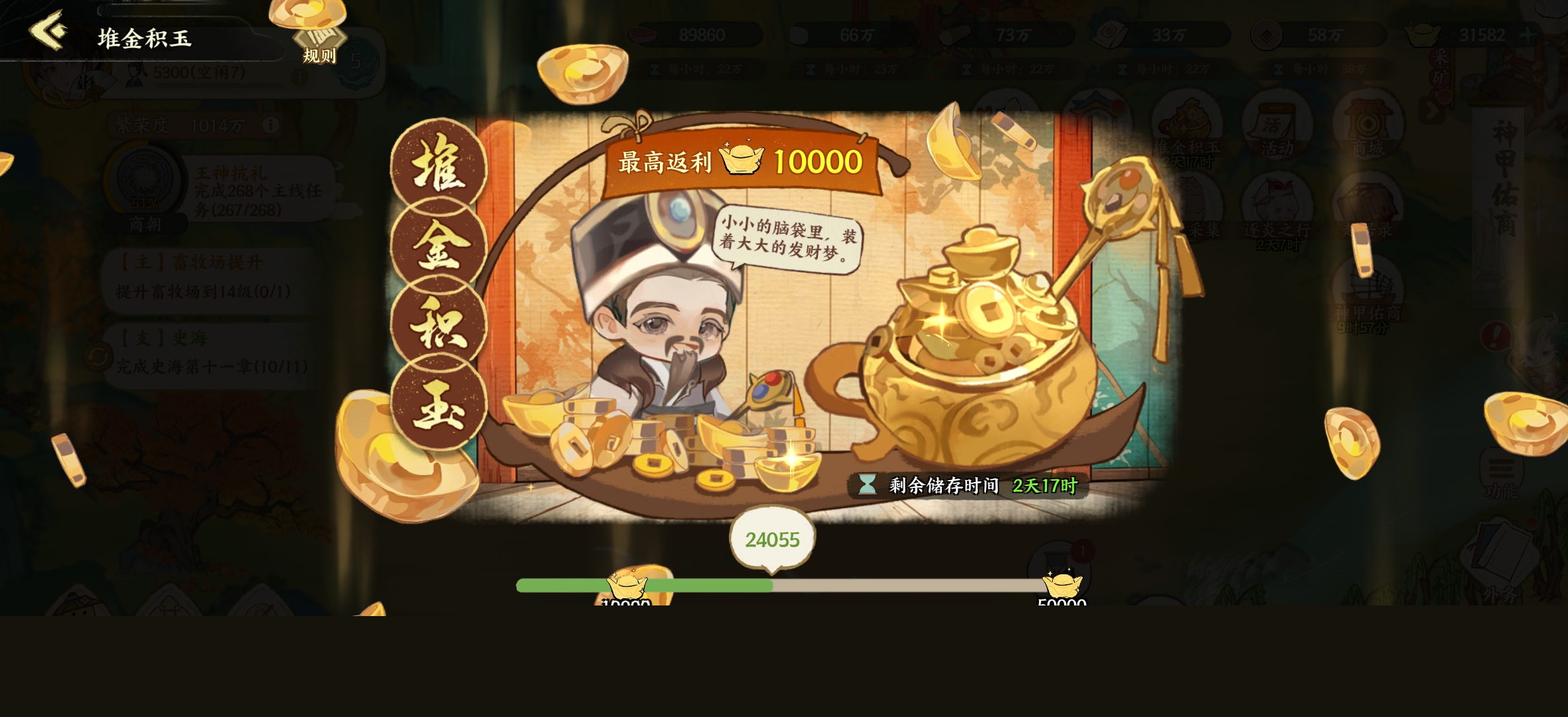 有堆金积玉活动再买,算上逐炎之行3.6万,用1.4万左右元宝买繁荣度礼包。
