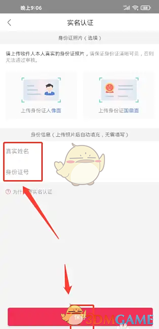 3、进入实名认证,输入真实姓名、身份证号,点击(保存)选项。