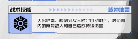 脉冲地雷:丢出地雷,检测到敌人时会自动激活,对范围内的所有敌人和自己造成持续伤害。