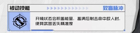 致盲脉冲:开镜状态会积蓄能量,蓄满后射击命中敌人时,使其武器丢失精准度。