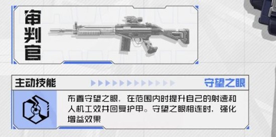 守望之眼:布置守望之眼,在范围内时提升自己的射速和人机工效并回复护甲。守望之眼相连时,强化增益效果。