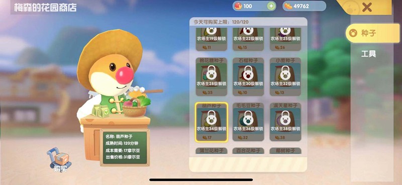 当玩家的农场主职业等级达到34级时,就可以在梅森的种子商店解锁葫芦种子并进行购买。葫芦种子的成本价为17摩尔币,成熟时间为120分钟,收获后可以在花婶处售卖获得31摩尔币,收益接近翻倍,是性价比相当不错的作物选择。
