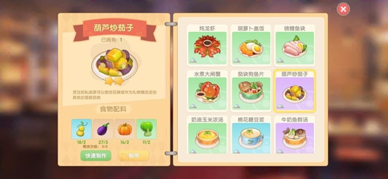 获得葫芦后,玩家可以在厨房开发新的菜谱。葫芦炒茄子需要葫芦、茄子、白菜和南瓜四种食材,而清炒毛毛豆则需要葫芦、奇异果和毛毛豆。这两个新菜品能够吸引更多顾客光临,为玩家的餐厅经营带来更多收益。