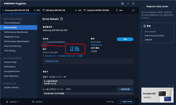 除此之外,鉴定三星固态硬盘还有个终极杀招——三星魔术师(SAMSUNG Magican)存储管理软件,它可以识别和管理三星旗下的所有存储产品,包括固态硬盘、移动固态硬盘、存储卡和U盘等产品。