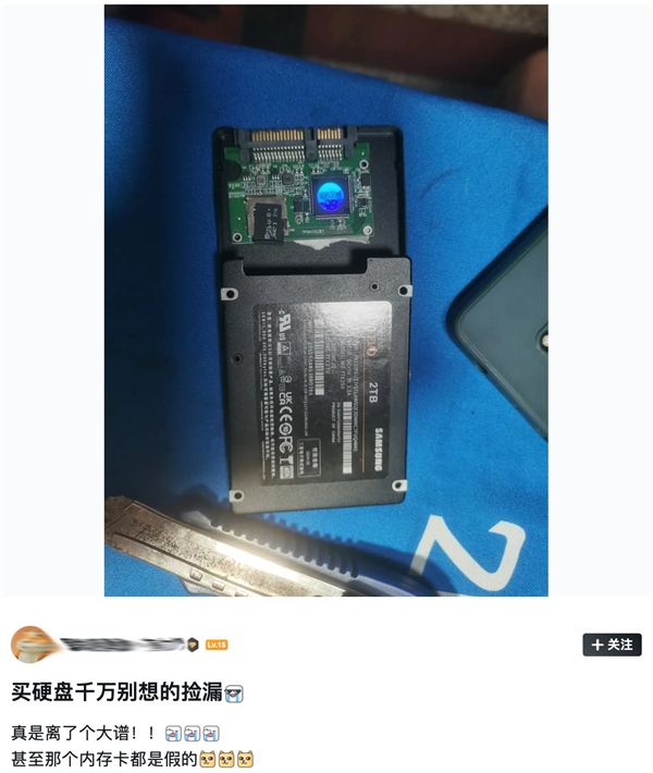 因为翻车这事已经有人帮你们体验过了,有网友爆料买了个二手的2TB固态硬盘,产品标签看起来也是三星870 EVO(也可能是稍早期的型号),不过拆开后却发现出奇的离谱,原来里面的PCB竟然是用一张TF卡搭配主控芯片转接而来,更离谱的是那个TF卡竟然也是假的,让人瞬间emo。