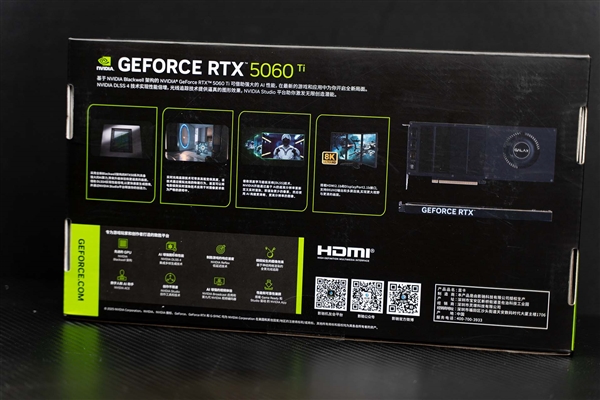包装背面为RTX 50系的特点,以及显卡的基础外观,在性能上,RTX 5060 Ti无双MAX和RTX 5060 Ti系列显卡没有大区别,DLSS 4等技术照常使用,主要差别还是在显卡的外观构造上。