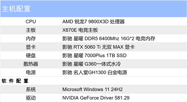 以下为本次的测试平台,RTX 5060 Ti 无双MAX在外观上虽与专业卡相似,但本质上还是一张游戏显卡,在一些领域无法完全顶替专业显卡,但在外观上,它也是目前单槽游戏显卡的优选。