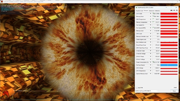 在默认情况下,使用Furmark进行烤机温度测试,选项为2K分辨率+4x MSAA,在10分钟烤机下,功耗达到了接近180W,核心平均温度为78.6度,显存平均温度为81.2度,风扇的转速为2414转(60%),是噪音和温度之间的一个平衡点,如果拉满转速,那么核心温度确实会下降至68度左右,显存温度下降至74度,但是噪音估计难以接受,毕竟是涡轮风扇,但对于只要性能和散热的用户来说,速度拉满也是能接受的选择。