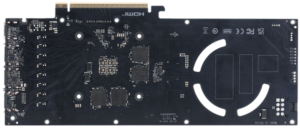 显卡背面与前面板风格一致,依旧是黑黑的简约风,并且在涡轮风扇背部对PCB板进行了镂空处理,这使得风扇能更好的从正面与背面吸入冷风,大大增加了进风效率。并且金属背板也不对背板进行完全覆盖,对核心背部和背部显存有着散热辅助作用。