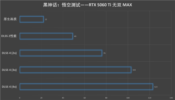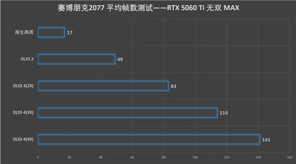 首先是我们的经典游戏《赛博朋克2077》,在2K分辨率并开启光线追踪超速的情况下,原生帧数仅为17帧,但在DLSS 2和DLSS 4多帧生成的加持下,最高可达141帧,可以说2K画质下RTX 5060 Ti 无双 MAX还是能胜任的。