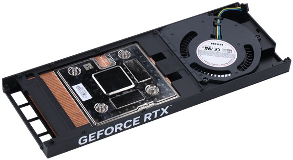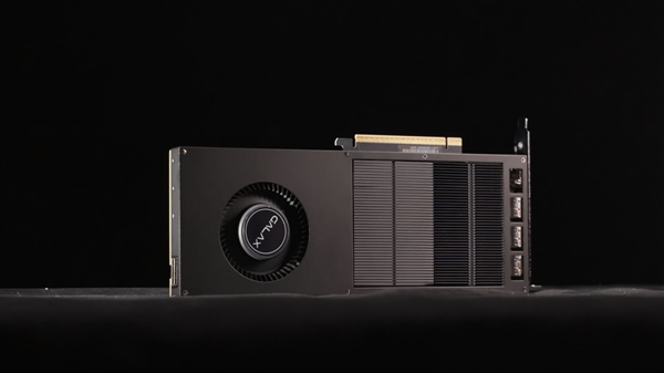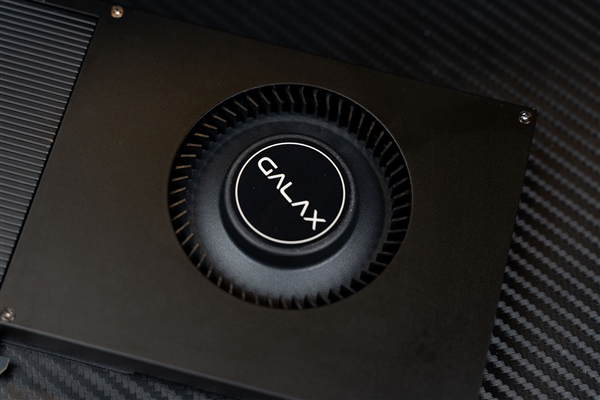 整张显卡的外观样子非常纤薄,颜色也主要以黑色为主,并且无光,风扇中心贴有影驰的GALAX LOGO,正面一半为金属散热板,侧面印有GEFORCE RTX,虽然看着很像专业卡,但RTX的LOGO依旧表示着,这是一张RTX系列显卡。