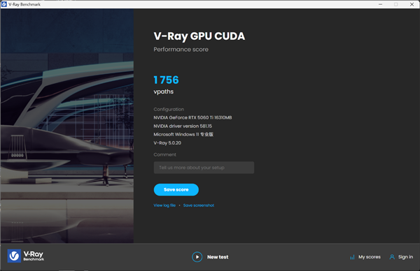 在V-Ray GPU CUDA项目中,影驰 RTX 5060 Ti无双MAX的得分为1756分。