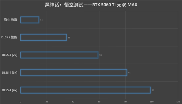 下一款则是风靡全国的国产3A大作《黑神话:悟空》,在2K分辨率+光线追踪极高的设置下,原生画质仅为14帧,开启DLSS 4后最高帧数为99帧,可以看出黑神话还是非常吃性能的。