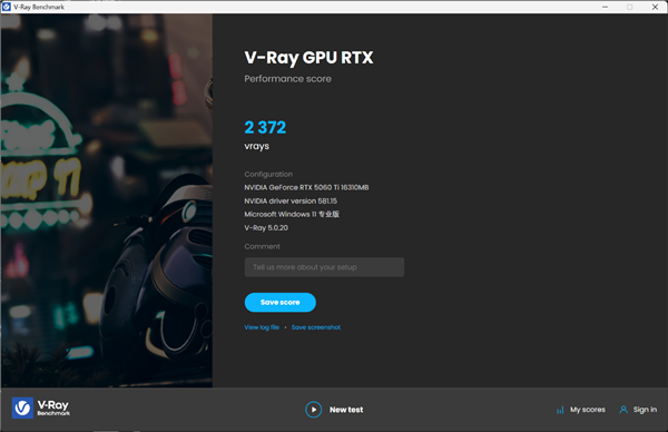 在AI&生产力测试中,首先登场的V-Ray,它比较考验显卡的图形处理能力,在V-Ray GPU RTX项目中,影驰 RTX 5060 Ti无双MAX的得分为2372分。