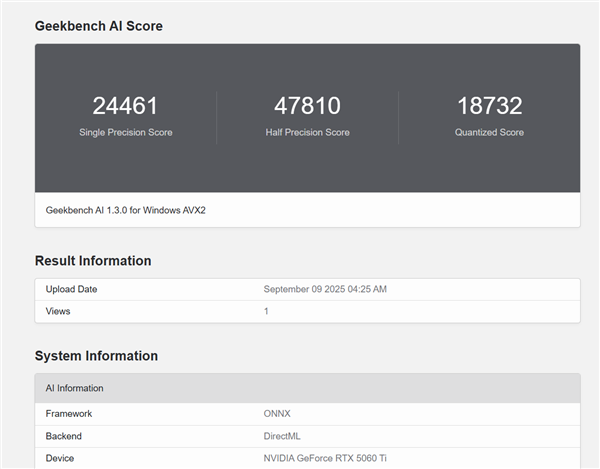 下一项为GeekBenchAI基准测试,它通过模拟现实场景中的深度学习任务,来评估显卡的AI性能,影驰 RTX 5060 Ti无双MAX在单精度测试中得分24461分,半精度测试得分为47810分,量化神经网络测试得分为18732分。