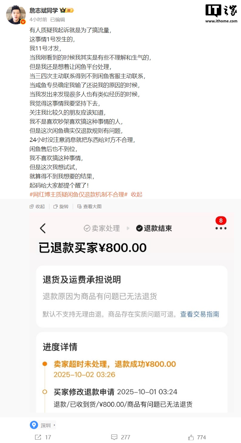 时间:2025-10-14 | 作者: | 阅读:010 月 13 日消息,网红博主 @詹志斌同学 今日在微博发文称,自己在闲鱼平台出售价值 800 元的闲置物品,但买家收货后说物品无法使用,詹先生让其退回,可对方却在平台申请了仅退款。