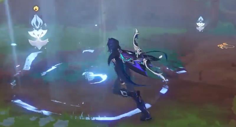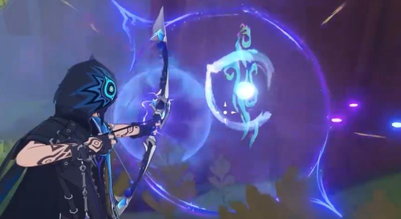欧洛伦的普通攻击宿灵闪箭可以进行三段连续弓箭射击,重击时会将雷元素附着在箭矢上,释放出更具威力的瞄准射击。当玩家长按瞄准按钮时,欧洛伦会进入灵觉状态,这种状态下他能够从灵谜涂鸦和灵谜纹中汲取力量,使箭矢威力大幅提升。在空中发动下落攻击时,欧洛伦会释放箭雨造成范围伤害,有效应对多个敌人。